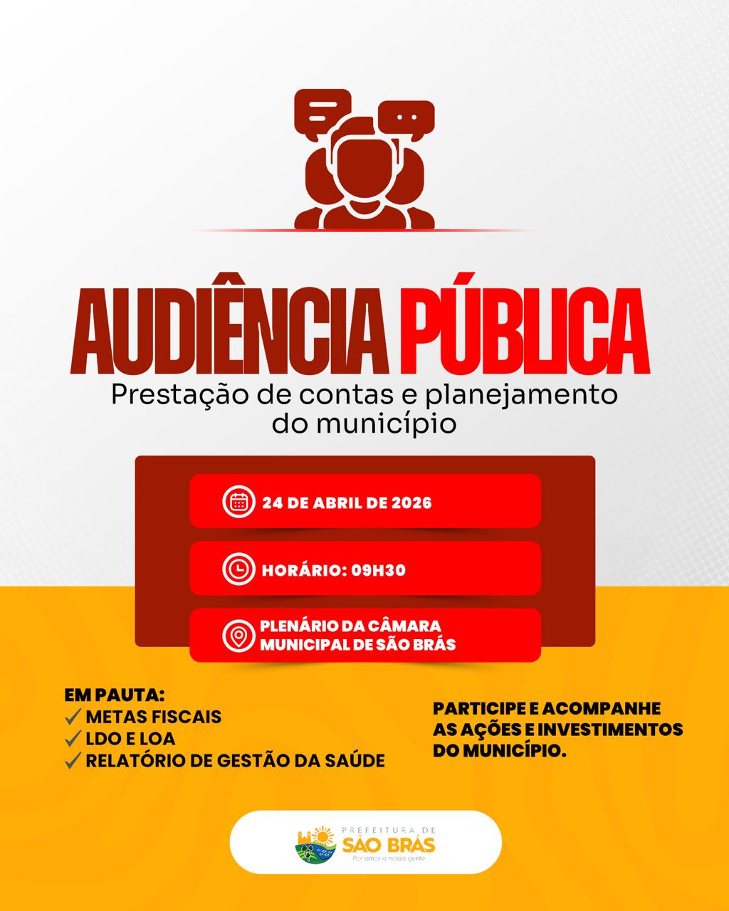 A Prefeitura Municipal de São Brás, convida toda a população para participar da audiência pública sobre a Prestação de Contas e Planejamento do Município. O encontro será realizado nesta Sexta-feira, dia 24 de abril, às 09h:30min, no Plenário da Câmara Municipal de São Brás.
